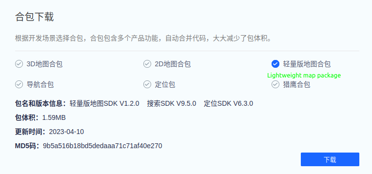 The AMap SDK is freely available to download from here. The functionality explored here is contained within the “lightweight map package” (轻量版地图合包) version.