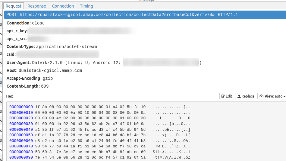 Observing the network traffic with MITM proxy one API endpoint stands out, /collectData: