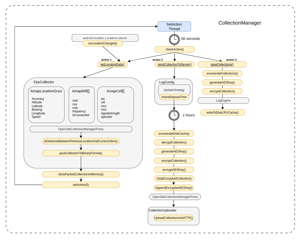 • A thread runs periodically which obtains location information, encrypts the data with AES and stores it in a “LRU cache database”