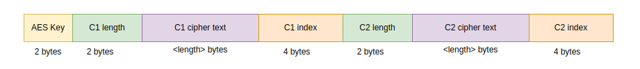 Now the data will be written to persistent storage. A unique AES key is generated and prefixed to the record. Each collection entry is encrypted with this key with the length value prefixed. The integer values are stored as two bytes.