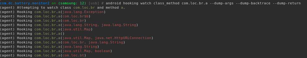 android hooking watch class_method com.loc.br.a --dump-args --dump-backtrace --dump-return