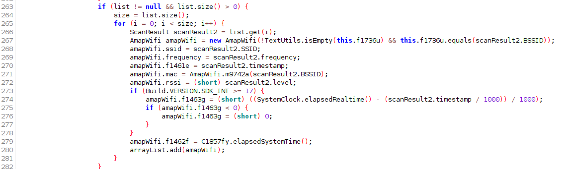 For Wifi scan results, android.net.wifi.ScanResult are stored sequentially and the BSSID, SSID, frequency and timer values stored in instances of AMapWifi which will later be serialised.