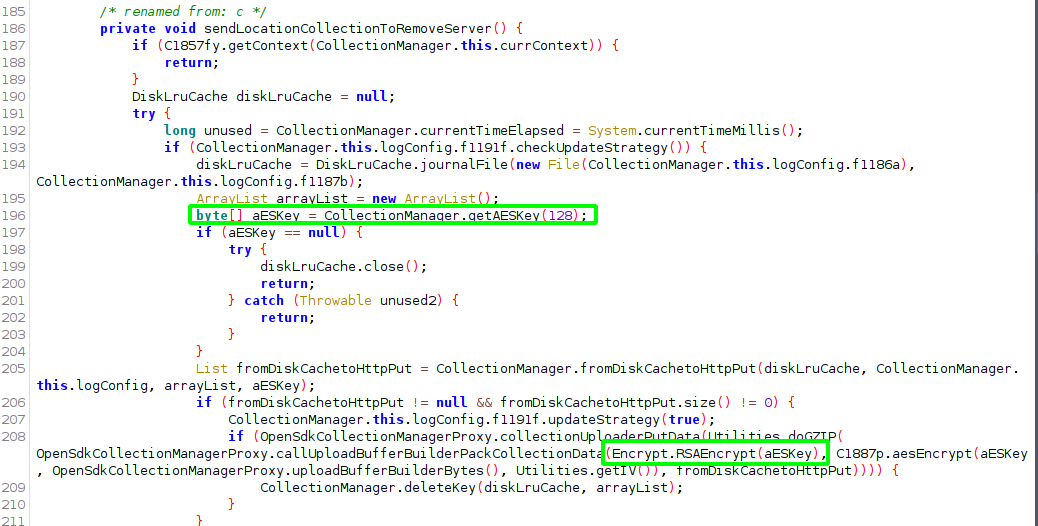 • Encrypting the data with an AES key generated on the fly. The AES key is then encrypted with a hard-coded public RSA key stored in the application’s code. This ensures that it is impossible to decrypt the traffic over the wire unless one is in possession of the corresponding private RSA key.