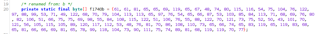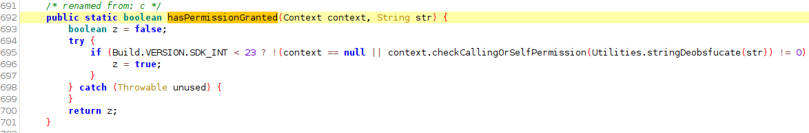 So we can see they were trying to hide ACCESS_WIFI_STATE and ACCESS_WIFI_STATE. A quick way to extract other obsfucated strings from the decompiled source: