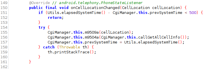The cell ID (CID and LAC) is achieved by extending android.telephony.PhoneStateListener.onCellInfoChanged to obtain the current CellLocation as well as obtaining “all available cell information from all radios on the device including the camped/registered, serving, and neighboring cells” by calling android.telephony.TelephonyManager.getAllCellInfo()