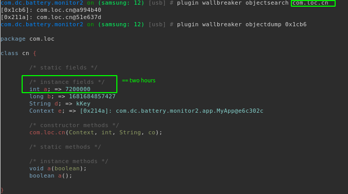 The HTTP request was sent particularly infrequently, making it somewhat frustrating. Before invoking the HTTP request, a timer which is an instance of TimeUpdateStrategy (com.loc.cn) is checked. Using Frida we can see that the threshold value is set to two hours: