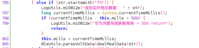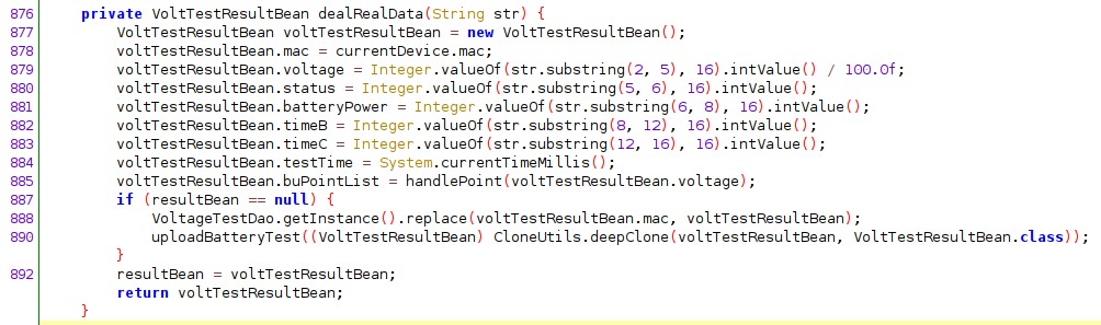 The BleService class implements a basic state machine. In the default state (powered on) messages prefixed with 0xF5 call dealRealData which extracts and calculates the voltage and charge:
