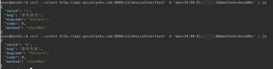 On initialisation the application a HTTP GET request, sending the Bluetooth MAC address to http://api.quicklynks.com:8080/v1/deviceInterface with the method parameter value of checkMac. It appears that the back-end database checks that this is a real provisioned device. Changing a single byte value in the MAC address from a valid one to something else returns a failure. It appears that MAC addresses are random (with the exception of the vendor ID)