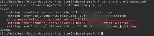 This check is only done once; the MAC address of the bm2 device is stored in the shared preferences under the key name genuine_list: