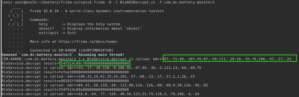 Hooking the decrypt() method while running the application yields the cyphertext and plain text for each BLE message: