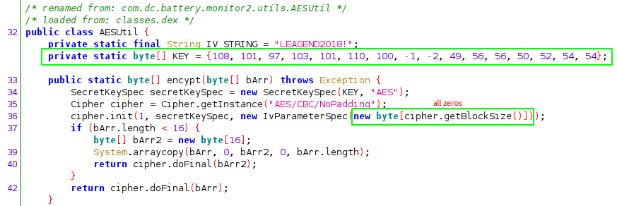 Each characteristics message that is received is first decrypted. The decryption key is hard-coded, represented as an array of signed integers. The initialisation vector is 16 bytes of zeros: