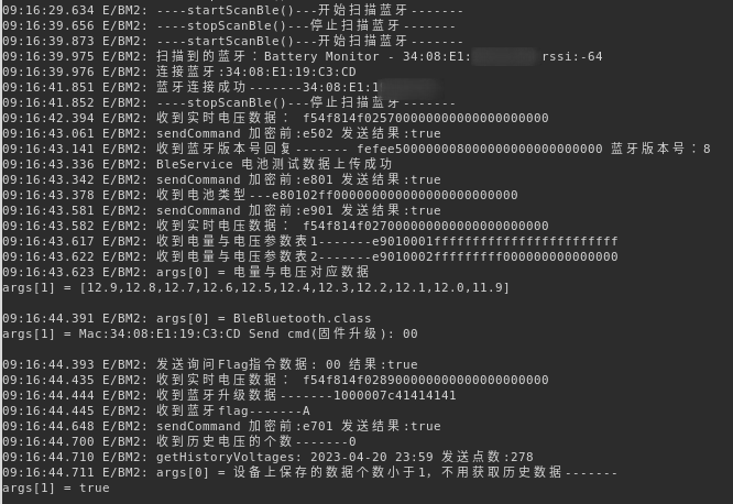 The BleService class implements a basic state machine. In the default state (powered on) messages prefixed with 0xF5 call dealRealData which extracts and calculates the voltage and charge: