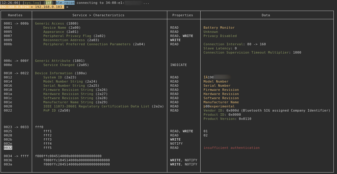 ble.enum <mac> does some basic enumeration on the service characteristics, although this does not reveal anything too useful. All it really tells us is the BM2 device is sending generic responses for the standard characteristics. Rather then provide the model number it responds with the string Model Number. One has to wonder if there was some cut-and-paste efforts here.