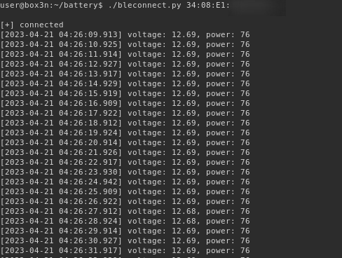 Let’s use the BLE GATT python library Bleak to receive the voltage/charge data from the BM2 device and put together the previous findings to decrypt the characteristics values and decode the voltage and charge/power value: