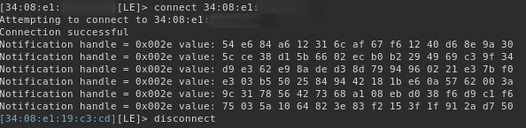 The handle 002e which has the property NOTIFY (reported by bettercap) is consistently sending what appears random bytes. This is indicative that it’s encrypted data - and we know the AES key. What we are missing now is the characteristics value for the handle with the NOTIFY attributes.