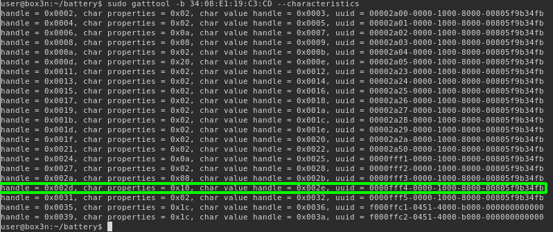 Using --characteristics switch will do discovery. Here we can see value handle 0x002E with a uuid value of 0000fff4-0000-1000-8000-00805f9b34fb.