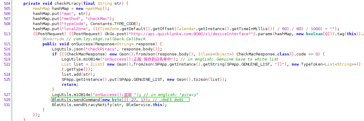 If any of these three strings match then a connection. OnConnectionStateChanged callback stops the BLE scanning and an “anti-piracy” check is peformed to detect counterfit hardware. This sends the devices MAC address over a HTTP request to the Internet. Internet traffic is also generated on characteristic change events (onCharacteristicsChanged callback).