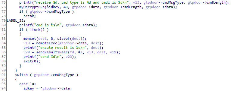 I have given this malware the name GTPDOOR as it uses a similar “port knocking / magic packet” technique as BPFDOOR as described here and here. Both use raw sockets to intercept packets on the network interface. Unlike BPDDOOR, GTPDOOR explicitly uses GTP-C echo request/response messages and does not utilize BFP / pcap filters, but rather filters on UDP and GTP header values through simple cmp instructions. At the time of writing, I am not aware of this malware being documented anywhere else.