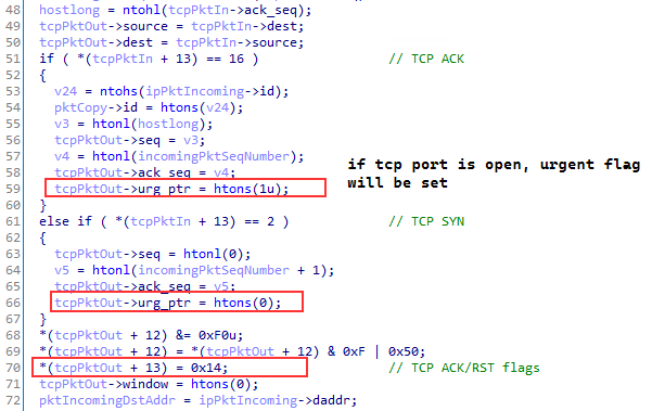 The probe response packets will always have the ACK/RST flags set and the urgent pointer flags set according to if an TCP ACK was observed. This is a covert way of encoding messages by bit manipulation in the TCP header.