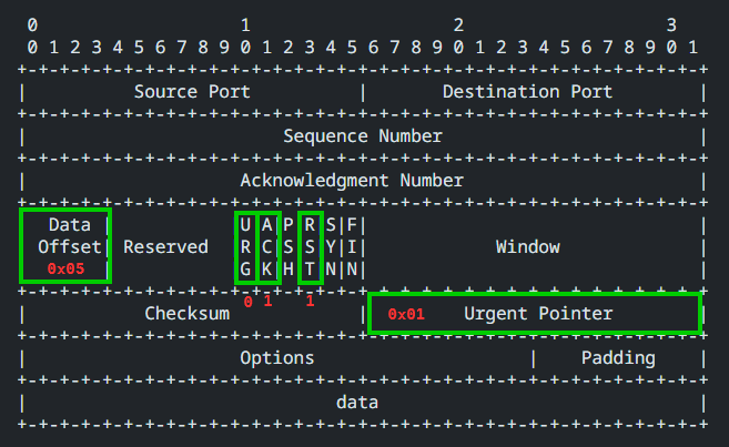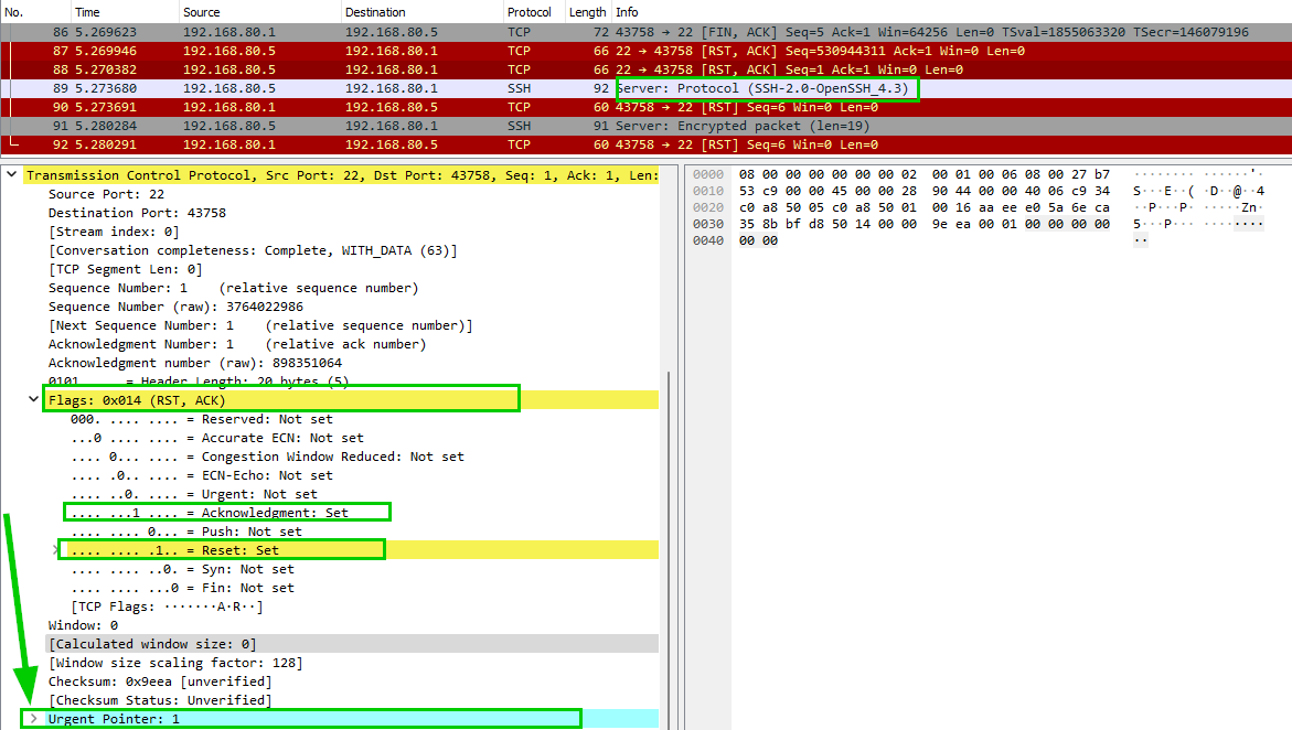 On the other hand, when the client connects to an open port 22 (SSH), the probe response includes a RST/ACK but this time with the urgent pointer set to 1