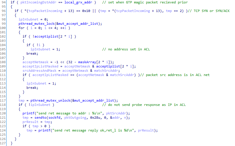 The TCP probe is a feature that allows an external host to probe the GRX listening address for TCP packets. A subnet filter is checked against the source IP address of the “client” and if it does NOT match, a reply beacon is sent to the (scanning) client. A crafted TCP RST/ACK response packet with the urgent pointer field set to 0x01 indicates the implant is running.