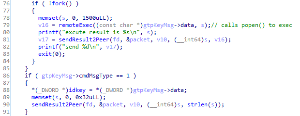 On “remote command execution”, the process is forked() and popen() is utilized to execute a subprocess on the host.