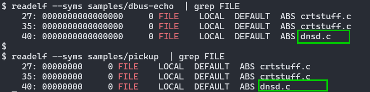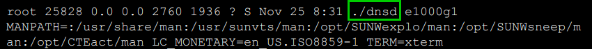 As we will see below, both binaries contain the name of the original c source file, dnsd.c. A google search links to a presentation by CrowdStrike about this threat actor that contains text from a process listing originating from what looks like a Solaris machine. In that listing is a process with the name dnsd: