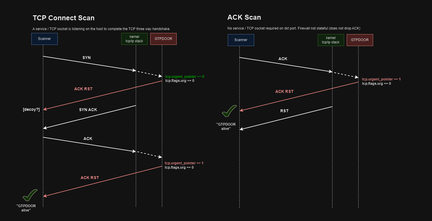 For a TCP connect scan to work, there must be a service listening and port exposed on the host, either from a permissive firewall or no firewall at all. GTPDOOR will send a “decoy” TCP ACK/RST response on the initial TCP SYN from the client but with no identifying information to indicate GTPDOOR is running. It is the second TCP ACK/RST that is sent on the client’s ACK that has the urgent pointer set to signal GTPDOOR is running on the remote host.