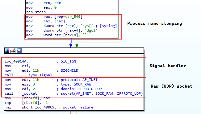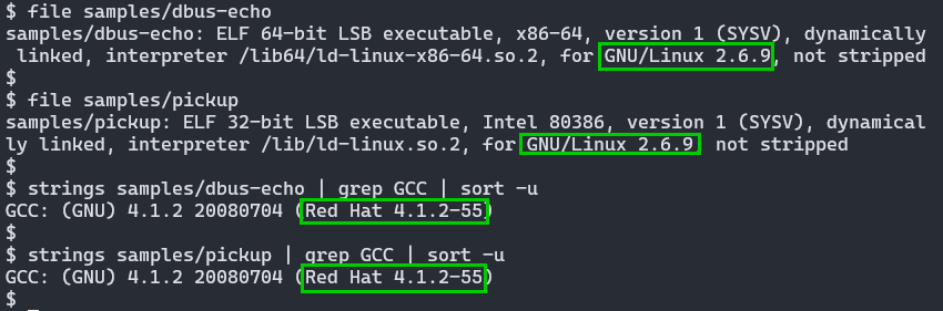 Both binaries were targeted for a particularly old Linux distribution, “Red Hat Linux 4.1”. This is the equivalent to RHEL 5.x. The GCC date is marked 2008. It is quite likely the target network operator of this implant had quite poor patch / lifecycle management.