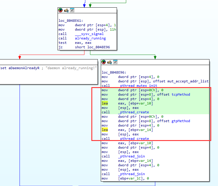 As the binary was not stripped and debug symbols left in, we can see the original function names tcpMethod and gtpMethod which run in two pthreads: